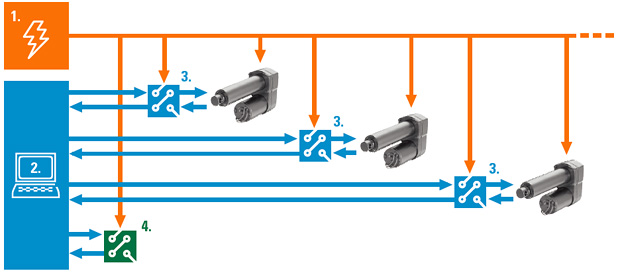 • 主控制 (2) 系統與獨立的、連接至直線推桿的控制 (3) 盒進行單獨地通信。可能每種情況都需要單獨的設計、配置、布線和安裝。